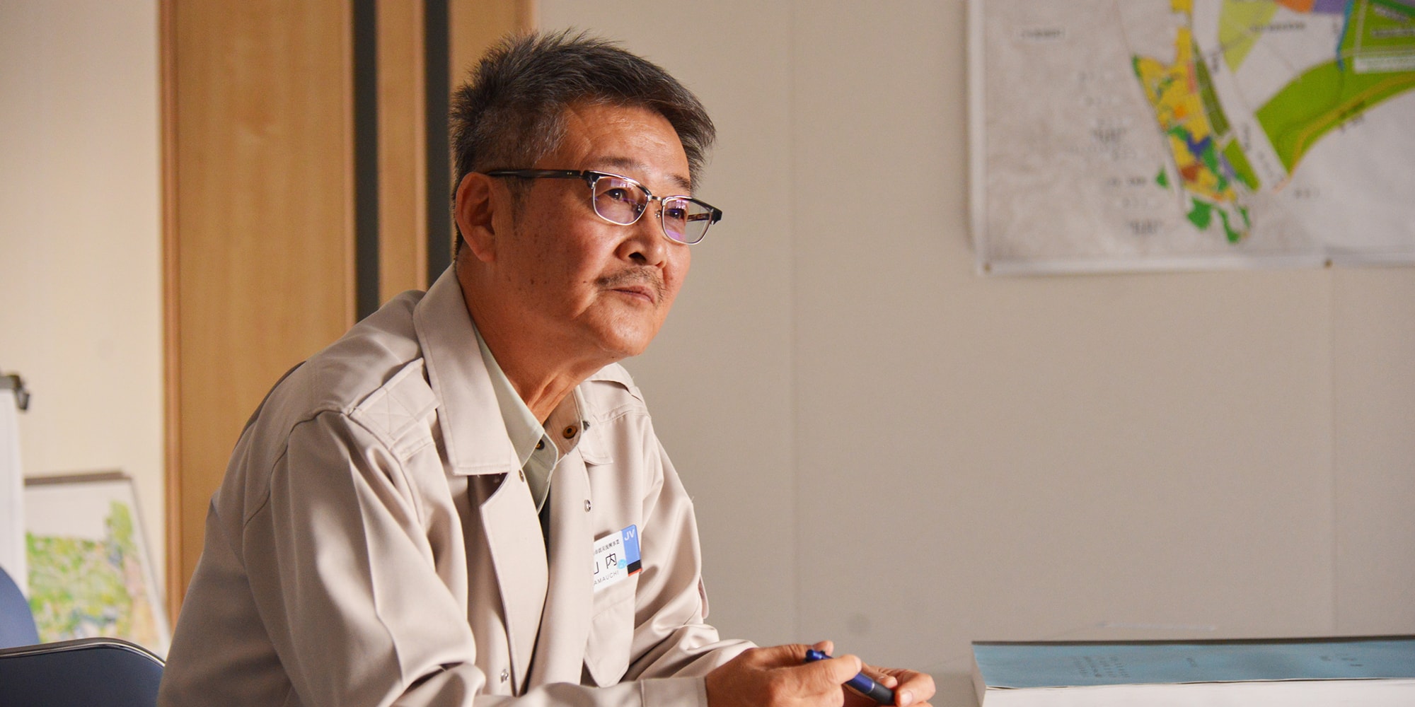 赴任して7年、現在は陸前高田に来て、この仕事に携わることができてよかったと心の底から感じている。「陸前高田の工事が10年の節目を迎える2021年に市へ引き渡しを行います、それで最後かな。7年前の陸前高田の状況を思えば、工事はずいぶん前進しましたし、実際にいくつかの宅地では住民の方々への引き渡しもできています。こうして復興の端緒を見ることができるのは、感慨深いですよ」と、表情を引き締めつつも穏やかに語る山内所長。陸前高田での大きな経験を、今後は若手社員に伝えていきたいと思っている(2020年取材)。