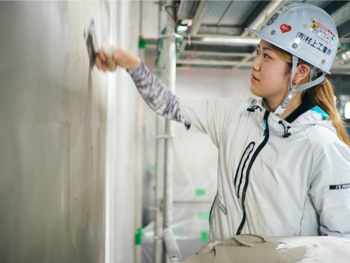 現在は女性社員第1号として、先輩たちに学びながら壁や床を塗る日々に邁進する。「もちろん初めての作業にはつまづくこともあります。でも、見て覚える感じがスポーツに似ているなと感じます」。そんな競技活動で培った向上心や、幼い頃から実家の農作業で鍛えた体力も現場で生きているようで、男性に対し体力面で劣ることは少ない。また “女性だから”と特別扱いされることもなく対等に接してもらえていると話す。