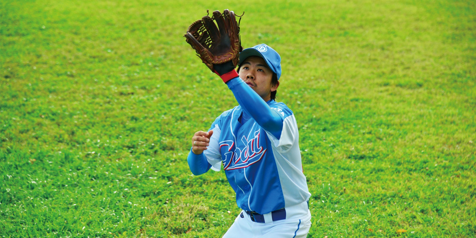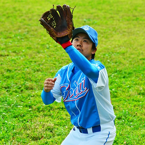 互大設備野球部の基本カラーはスカイブルー。ヘルメット、ユニフォームとも爽やかな青空色がグランドに映える。グラブは使い込んだミズノ製で、やわらかい皮が自分の手によくなじんでいて、内野守備にフィット。