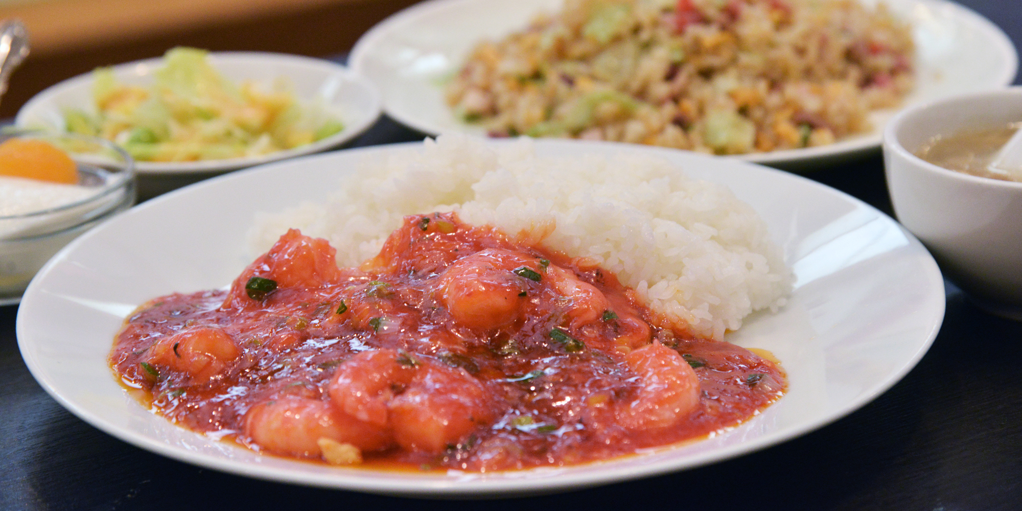 「海老のチリソース煮」は、プリプリの海老の食感と甘めのソースの組み合わせが抜群で、ご飯との相性もいい。「お客さんに喜んでもらうのが一番。ボリューム? そんなに意識してはいないけど、たくさん食べたい人も多いだろうから」と、張さんはおおらかに話す。