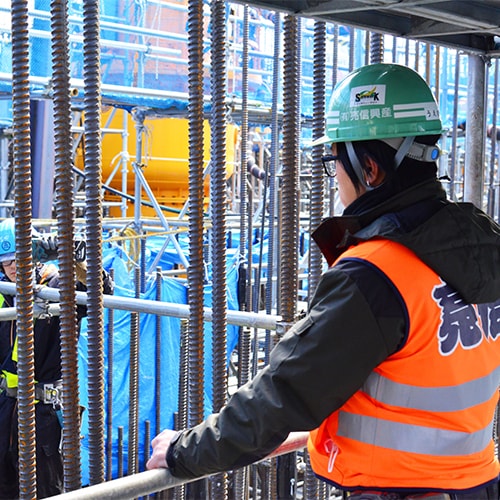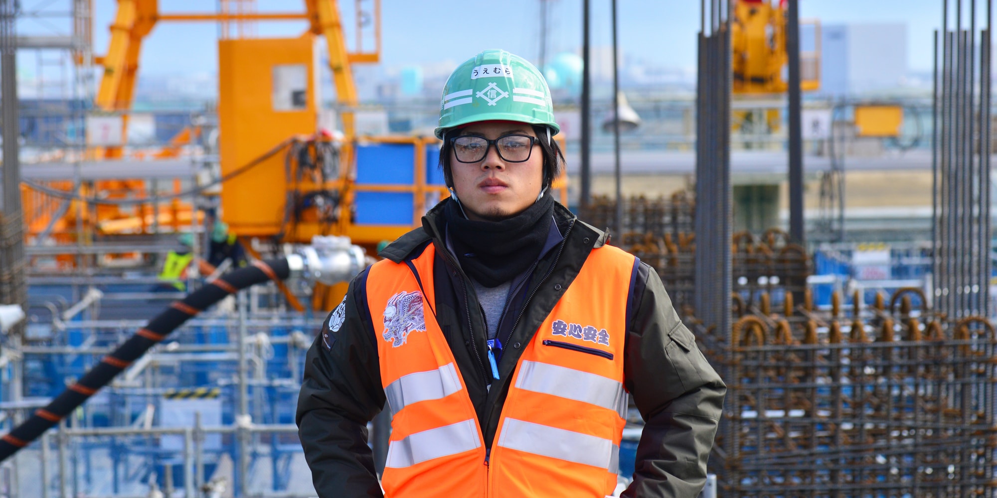 東日本大震災の時は高校生。9年経った今、震災復興に関わる工事現場にいる。「地元ですし、感慨深いですね。自分の地元は石巻市の雄勝なので、かなりひどく津波でやられました。少しでも復興の役に立てる現場に関われるのは、うれしいですね。石巻中央排水ポンプ場は、今後何十年も残る建物でしょうし、最後まで一生懸命造っていきたい」と、上村さんはその眼差しに強い決意を込めて話してくれた(2021年取材)。
