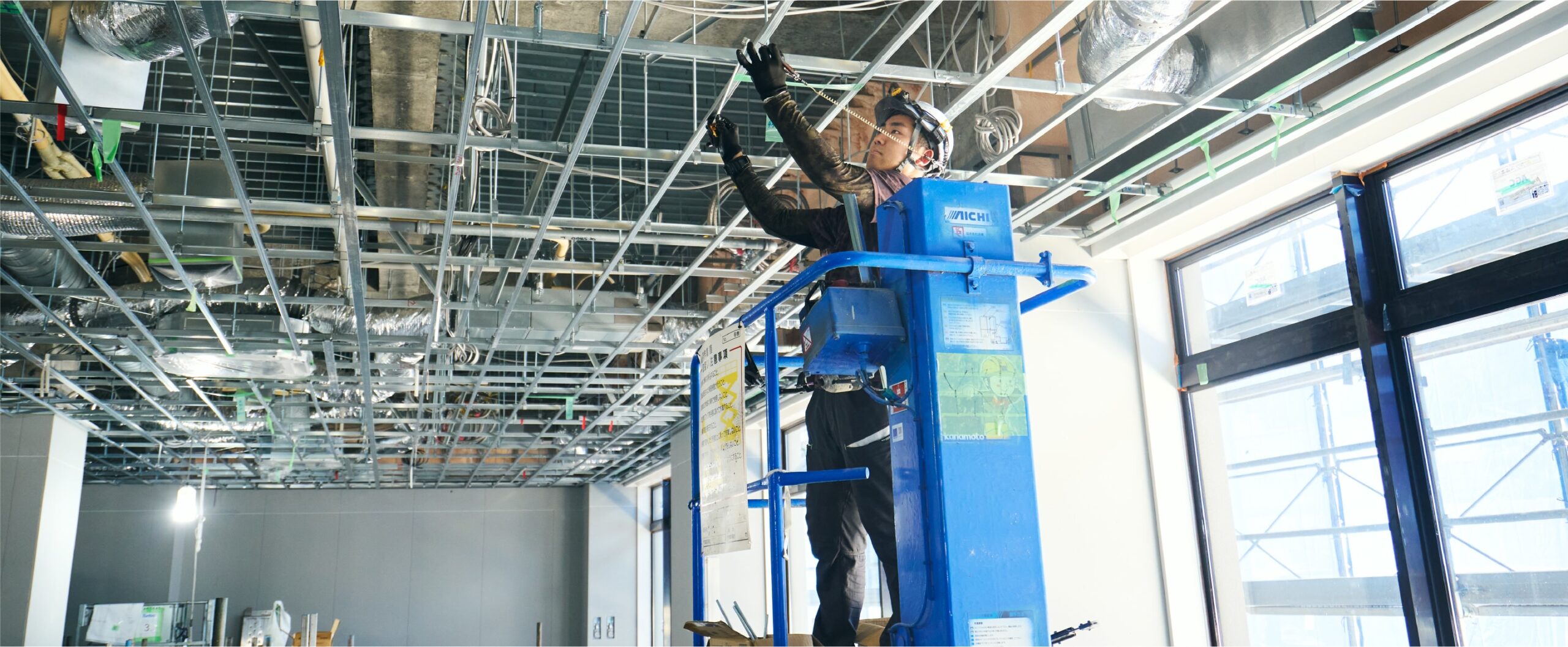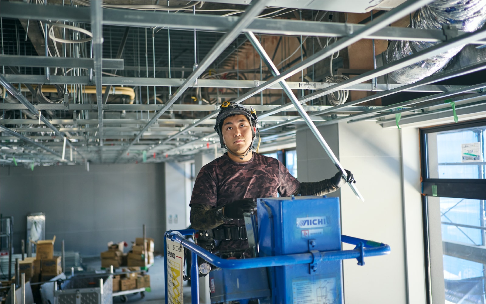 「下地もボードも“水平・垂直”の世界。ピシーッと決まると、気分が良くなるんです」。内装職人として5年間腕を磨いてきた田中さんの口調には、自らの仕事への誇りがにじむ。軽量鉄骨の下地を組み、その上にボード貼りをして天井や壁を仕上げていく工程は、完成後には表から見えない。しかし彼にとっては建物の美しさを支える基盤であり、一切の妥協を許さない。“どうせ隠れるから”ではなく、“見えなくても誇れるか”を自分に問い続ける姿勢がある。
