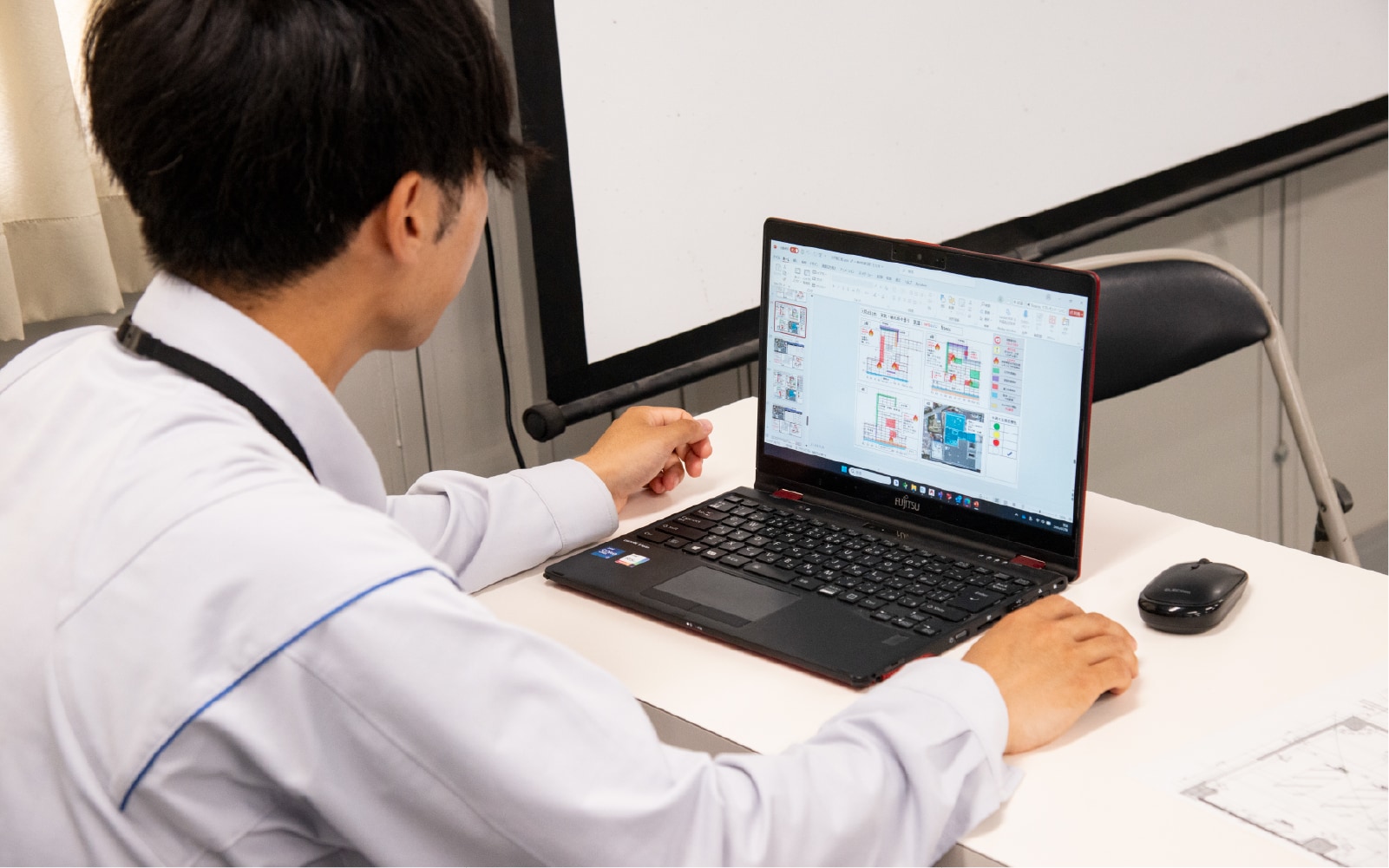 「1年目は職人さんも上司も何を言っているかわからなかった。業界用語も多いですし。コミュニケーション以前の段階ですよね。自分の伝えたいこともうまく伝えられない。それが慣れていくうちにだんだんコミュニケーションが楽しいと思えるようになっていきました」と当初の苦労を懐かしそうに振り返る。大きな現場になると、施工管理の若手だけで4、5人いる。それぞれに担当部門を受け持ち、現場を管理する者として職人たちと日々、話し合い、意見を言い合い、時には注意し、仕事を前に前に進めていかねばならない。職人は千賀さんの父親ほどの年齢の場合も珍しくはない。それでも仕事となれば伝えるべきは伝えなくてはいけないし、仕事にミスがあれば注意もする。そうした一切合切を含め、自分の描いた計画通りに工期が進み、仕上がった時の達成感こそが千賀さんの仕事のやりがいになっていく。「単に工期を守ってください、だけでは職人さんは動いてくれません。まずは信頼関係が大事です。信頼関係があってこそ、お互いの立場や仕事が理解しあえるし、仕事のための意見交換も率直に言い合える。そして建物を工期通りに進めることができるんじゃないかと、最近は思っています」と千賀さんはしっかりした口調で話す。