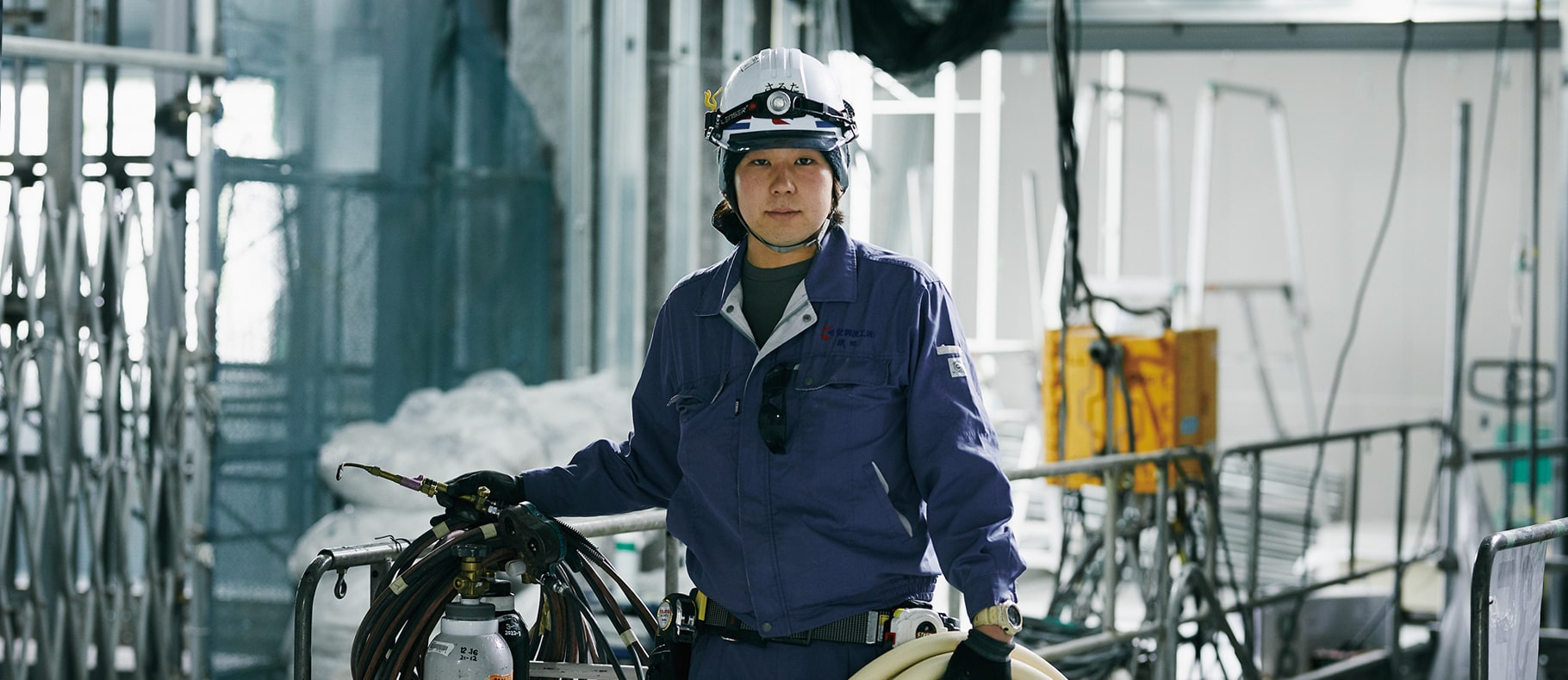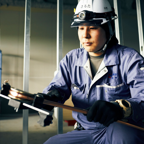 機械・電気系の学校を経て、この空調設備の仕事に就いた猿田さん。基礎的な知識や技術は有していたものの、やはり現場は違ったといいます。「自分は、何も知らない最初に大きな現場に携わったので、その時に結構苦労したな、と思います。でもそれは例外で、通常はちゃんと指導者が付いて教えてくれるんですけどね。基本的には何人かのチームを組んで現場に入るので、むしろ必要なのはコミュニケーション力でしょうか。エアコンの設置は、あらゆる配線や配管が収まった後の、最後の最後に行うことが多い。だから、時には頭さえ入っていかないような狭いところに手を伸ばして溶接を行ったり、天井を向きっぱなしで何十分という作業に取り組んだりすることもある。そんな過酷な時でも、笑って話をしながら一緒に仕事ができるのが理想です。工期の中でもだいぶ後半ですから、絶対に遅れられない局面でもある。自分は忙しければ忙しいほどやる気が出るタイプなので、同じタイプの人と仕事がしたいですね」(2017年取材)。