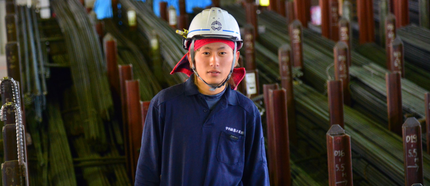 細身の体型だが、高校時代はレスリングでインターハイにも出場した。「体の動きが機敏で、バネがある」と宇内社長。しかし、本人は自身の力のなさを嘆く。「鉄筋ってすごく重い。しかも硬いから肩で担ぐ時、ちょっとコツがいるんですね。先輩たちはぼくの倍は軽く運びます」と横山さん。日々、新たな仕事を覚えながら1人前の職人を目指し鉄筋と向き合っている(2019年取材)。
