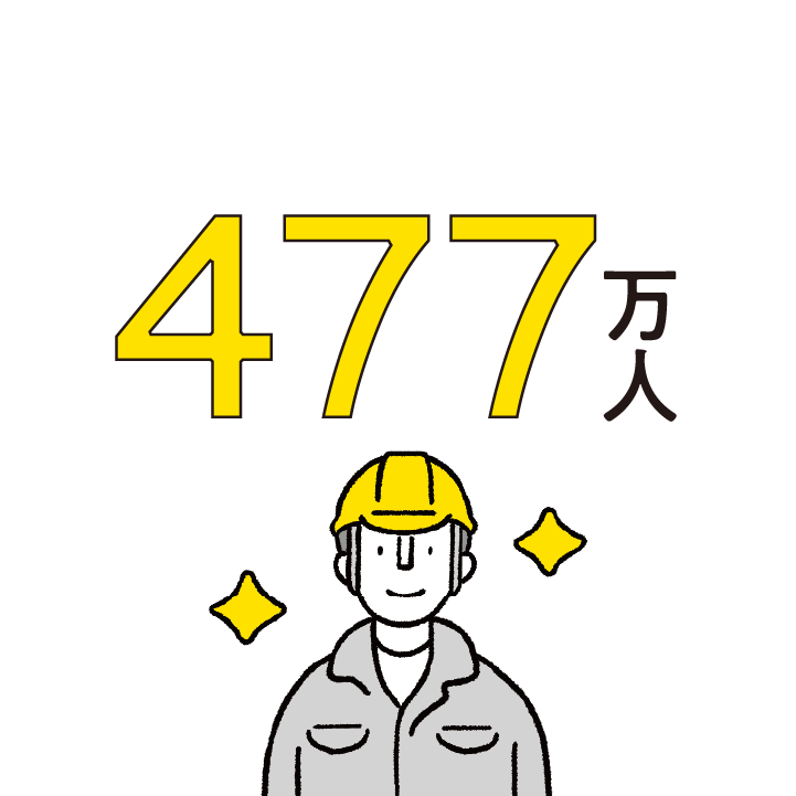 働き手不足が進行中。2024年における建設業の就業者は477万人で、産業全体の7.0%を占めています。少子高齢化や業界へのネガティブなイメージから、1997年の685万人をピークに減少が続いています。→総務省「労働力調査」