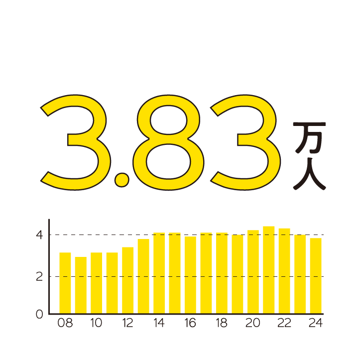キャリアの魅力アップ!新規学卒者の建設業への入職は、2009年の2.9万人を底に増加に転じたのち、2014年以降は少子化に負けず4万人台を維持していました。惜しくも2024年は11年ぶりに4万人を下回る結果に。→文部科学省「学校基本調査」、総務省「労働力調査」
