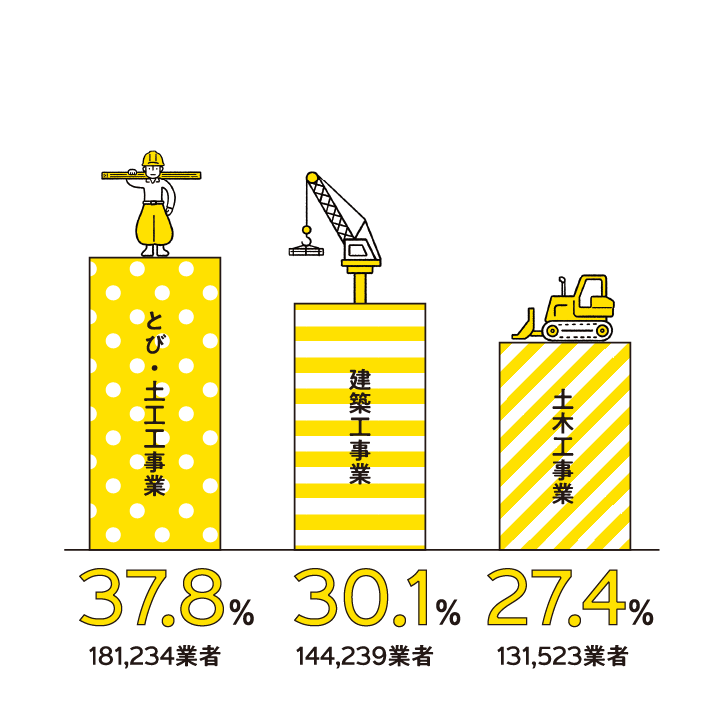 「建設業許可業者数」も再び増加へ。2024年における建設業許可業者数が多い業種トップ3は、「とび・土工工事業」、「建築工事業」、「土木工事業」。許可業者数は近年増加傾向にあり、建設市場が拡大していることの表れと言えます。→国土交通省「建設業許可業者数調査」